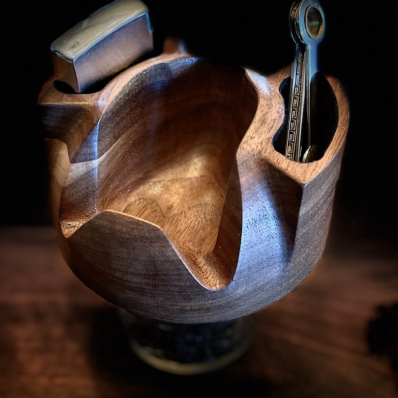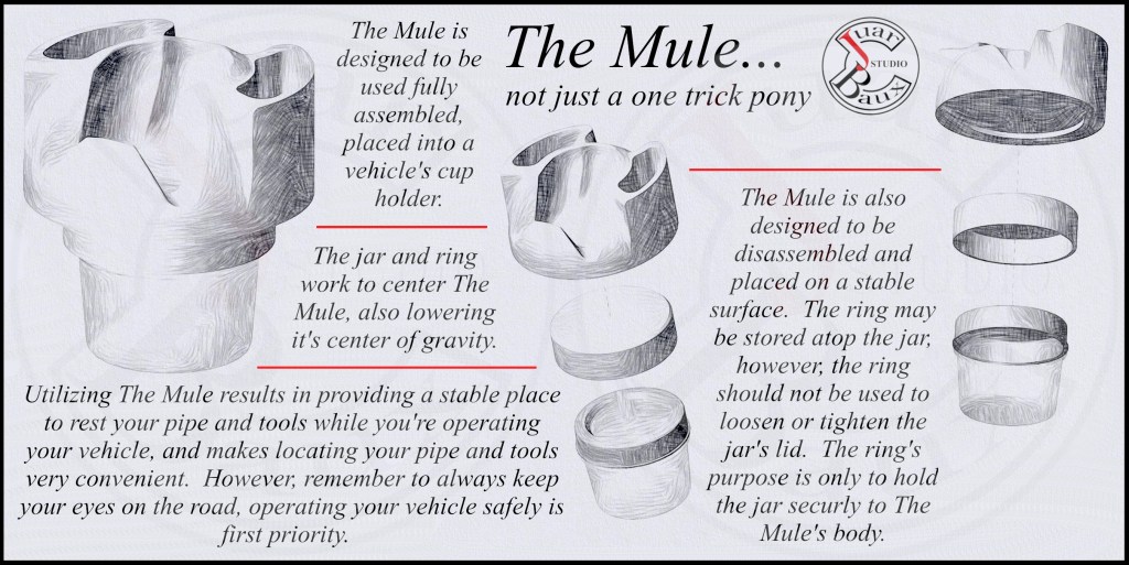 The Mule is designed to fit snugly into most standard sized cup holders, securely straddle a 4-ounce canning jar of your favorite blend, and cradle your cherished pipe of the day, while conveniently holding your preferred smoking tools for easy access while traveling in your vehicle. The Mule can also be disassembled, doubling as a tabletop pipe stand to accompany you on your stationary travels.